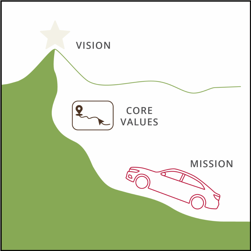 In the illustration below, the mountain peak represents our purpose and why we are on this journey in the first place. The vehicle represents the mission—what we are doing to achieve the purpose. The compass represents our core values and the guidance they give for the journey.