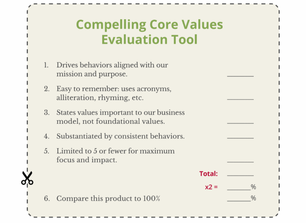 Your business’s core values should be discovered, not created. They are identified, not invented. This identifying process may be disappointing. You may wish you had a certain core value, but the behavior of your people does not align with that value. For example, I wanted to run a company with a core value of timeliness, but meetings consistently started late. Usually, it was because I wasn’t there on time. Naming “timeliness” as a core value would have discredited the whole exercise of identifying and using core values. Your attempt at using core values to build culture is undermined if you list “wannabe” values.