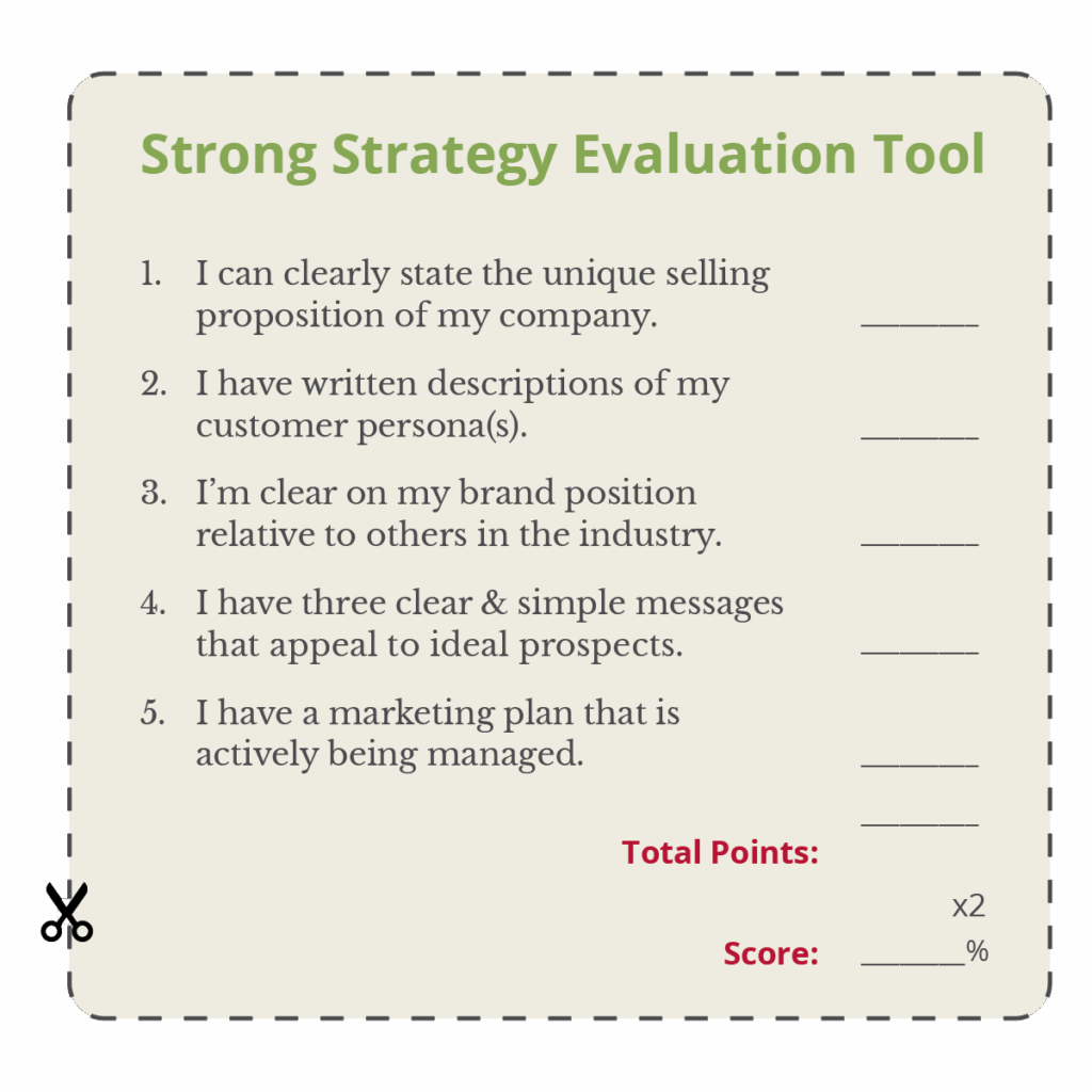How strong is the marketing strategy of your business? Use the tool below to evaluate this question. For each of the questions, rate yourself on a scale of 1 – 10, 10 being the highest. Then total your points and multiply by two to get a percentage score.